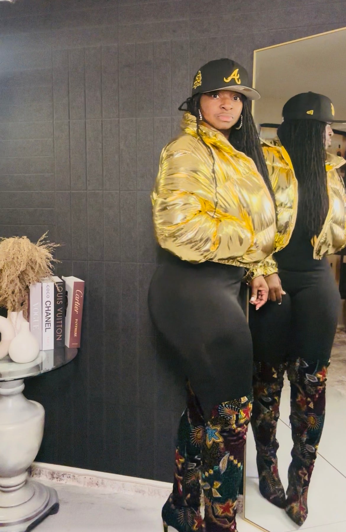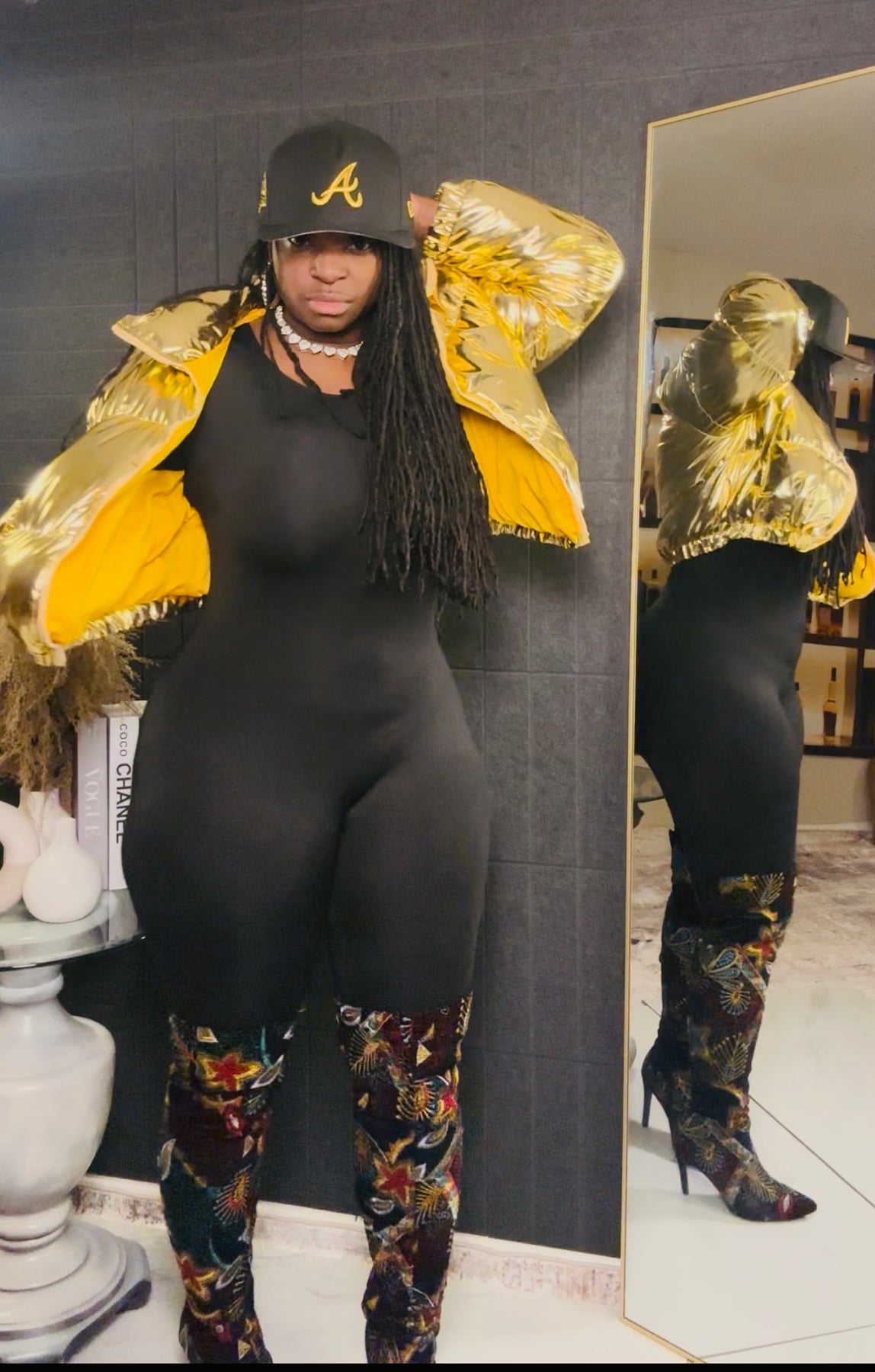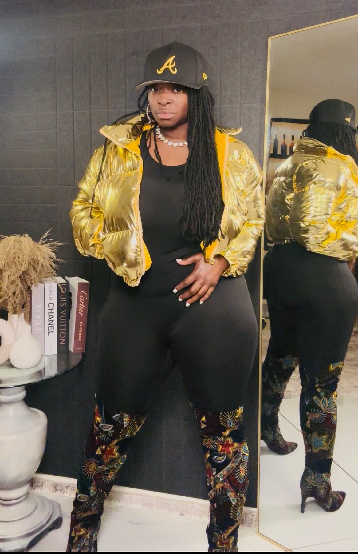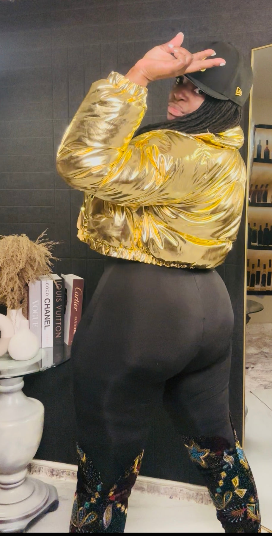 Available in Golden Metallic for that rich, boss energy and Pink Metallic for a fun, fearless pop, this jacket is perfect for layering over jumpsuits, bodysuits, or your favorite cold-weather fits.
